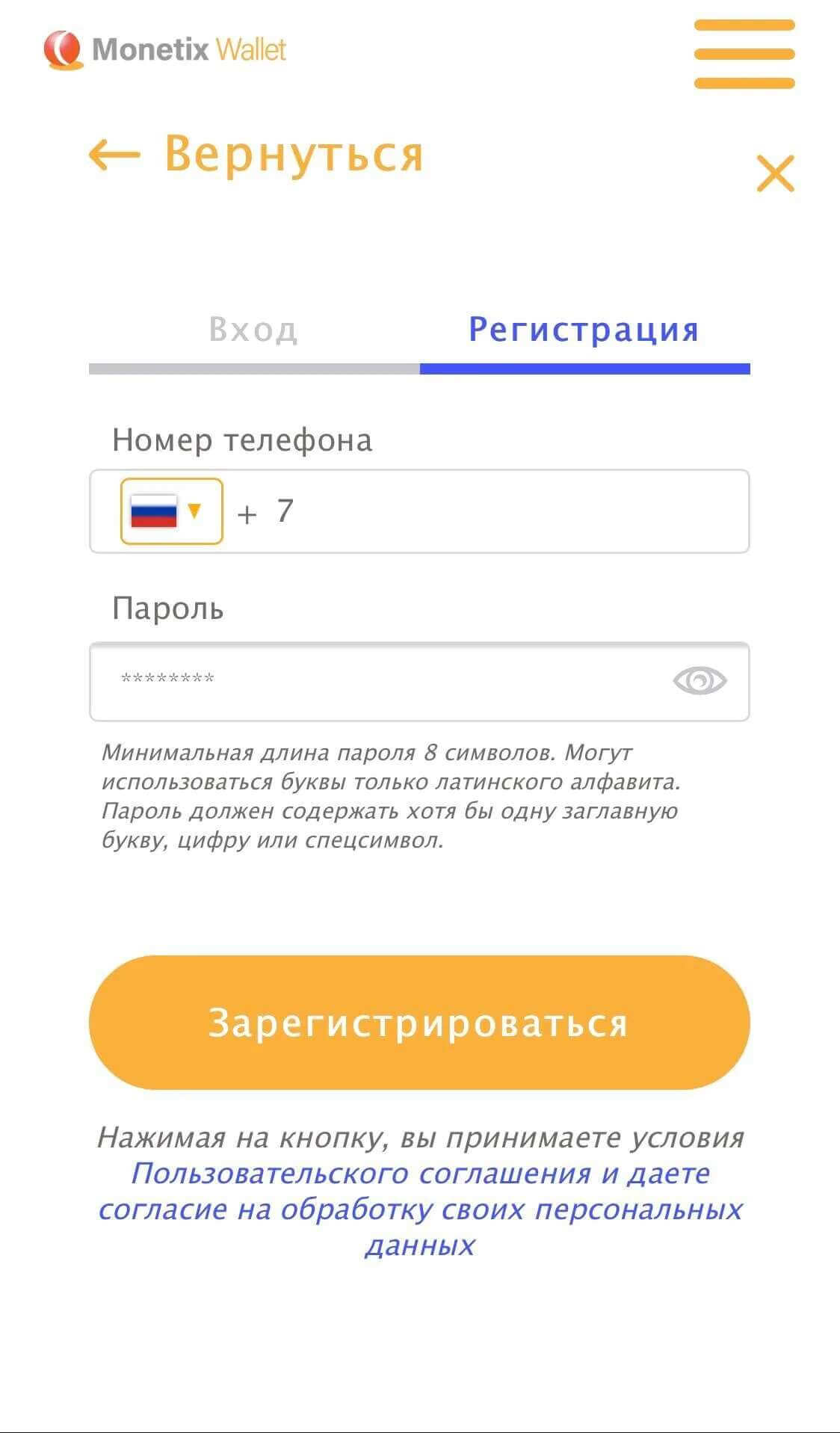 - 3. Ввести номер телефона и пароль, нажать кнопку "Зарегистрироваться", подтвердить через смс.